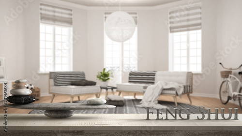 Wooden Vintage Table Shelf With Stone Balance And 3d Letters Making The Word Feng Shui Over Empty Scandinavian Living Room Modern Lounge Zen Concept Interior Design Buy This Stock Photo And Living Room Modern Zen Design Concept